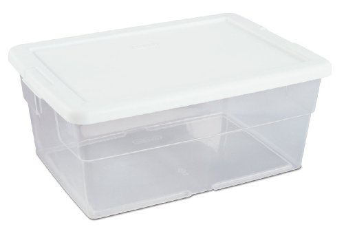 This pack of 12 medium sized 16 Quart Storage Boxes by Sterilite contain a see through base with white snap on lid. These versatile storage boxes work great in a kid's room for storing clothes, books or toys. Store your craft supplies and scrapbook materials in these boxes to keep them protected from the surrounding environment. Stack multiple on top of one another to save space and maximize your